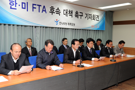 한나라당 제주도당(위원장 김동완)은 2일 오전 제주도의회 도민의 방에서 기자회견을 갖고 한·미 FTA발효에 따른 제주지역 1차 산업 피해 최소화에 최선을 다하겠다"며 "정부와 중앙당에 제주지역 피해대책 방안을 이끌어내겠다"고 밝혔다.