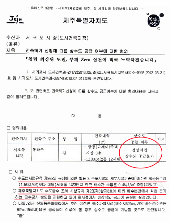 그러자 서귀포시 도시건축과는 다음 날인 7월1일 사업소에 급수계획변경과 급수조 설치 조건 등을 덧붙여 재협의를 다시 요청했다. 하지만 서귀포사업소는 다음날인 2일 또 다시 불허 통보를 내렸다.