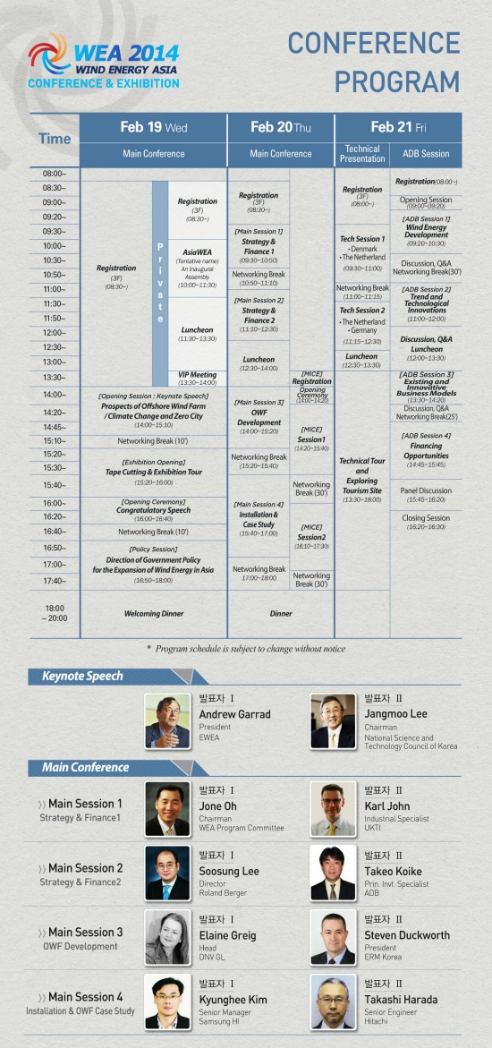 이번 WEA2014에서는 풍력 전문 컨퍼런스와 전시박람회가 기본이다. 세계적으로 내로라하는 풍력업계 거물급 인사들이 참석해 ‘아시아풍력협회(Asia WEA)’ 창립총회를 연다.