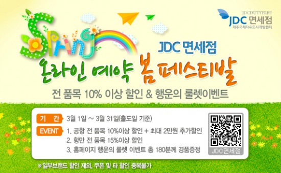 또 3월 한 달 동안 JDC면세점 홈페이지 회원 누구나 참여 가능한 '행운의 룰렛이벤트'를 통해 CGV영화예매권, 스타벅스 커피교환권, 편의점 상품권 등 경품을 총 180명에게 증정한다.