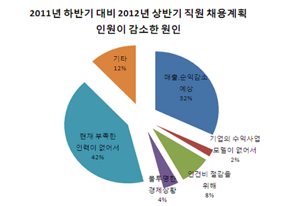 채용계획 인원이 감소한 원인으로는 '현재 부족한 인원이 없어서(42%)'가 가장 많았고 '매출, 순익감소예상(32%)','인건비 절감을 위해(8%)','불투명한 경제상황(4%)','기업의 수익모델이 없어서(2%)','기타(12%)' 순으로 조사됐다.
