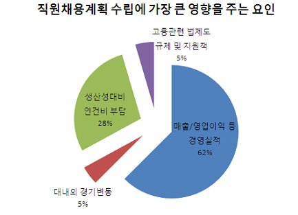 직원 채용계획 수립에 큰 영향을 주는 요인으로는 ‘62%’가 '매출.영업이익 등 경영실적'을 가장 많이 꼽았다. 이어 '생산성 대비 인건비 부담(28%)','고용관련 법제도규제 및 지원책(5%)','대내외 경기변동(5%)'순으로 응답했다.