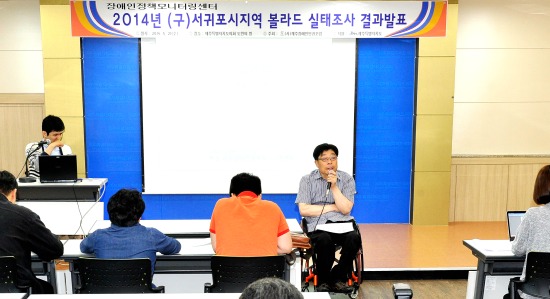 제주장애인인권포럼 부설 제주장애인정책모니터링센터는 21일 오후 제주도의회 도민의 방에서 기자회견을 열고 ‘2014년 서귀포 구도심지역 볼라드 실태조사 결과’를 발표했다.
