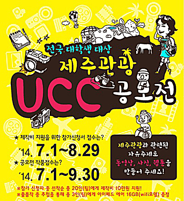 이번 UCC대회는 제주관광과 관련된 자유주제로 동영상, 사진, 웹툰 등 세 부문으로 진행된다. 제주도와 제주도관광협회(김영진 회장)가 주최한다.