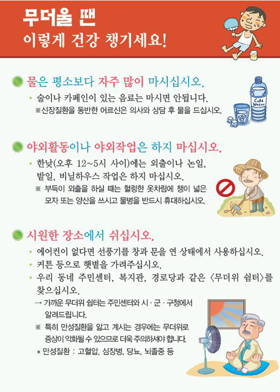 특히 홀로 사시는 어르신 등 고령층과 고혈압, 심장병, 당뇨, 뇌졸중 등 만성질환자는 무더위에 더욱 주의가 필요하다.
