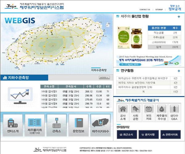 제주도개발공사(오재윤 사장) 물산업연구센터가 제주도 지하수 및 물산업에 대한 각종 정보를 탑재한 '제주워터정보관리시스템'을 오픈해 온라인 서비스를 시작한다.