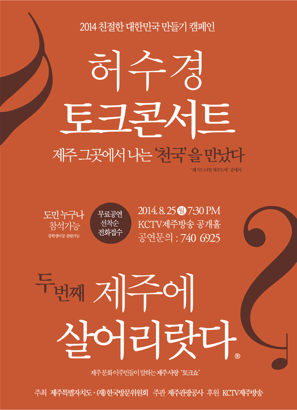 이번 허수경씨의 강연은 지난달 가수 장필순씨에 이어 두 번째. 제주로 이주한 문화예술인 및 방송인으로부터 제주의 매력과 진정한 가치는 무엇인지 들어본다. 그로 인해 도민들은 어떤 마음을 가지고 ‘다시 찾고 싶은 제주’를 만들 수 있는지 공유하기 위해 마련됐다.