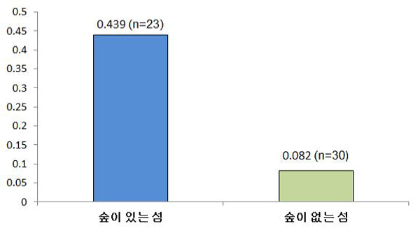 그 결과 생물종다양성 상대적 중요도 지수가 산림이 있는 무인도서는 평균 0.439, 산림이 없는 무인도서는 평균 0.082으로 나타나 약 5배의 차이를 보였다.