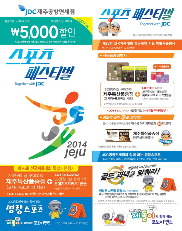 ▲35만 원 이상 구매 시 제주 특산품(고사리 + 표고버섯)세트 증정 ▲'95'영수증 번호 고객 대상 제주보리 크런치를 증정 ▲롯데카드 35만원 이상 구객 고객에게는 롯데기프트 카드 1만원 권을 제공 ▲미니 양궁게임 ‘골드 과녁을 맞혀라’▲꼬마 하루방 제돌이와 함께하는 ‘포토 이벤트’▲스포츠 선글라스 등 이벤트가 마련됐다.
