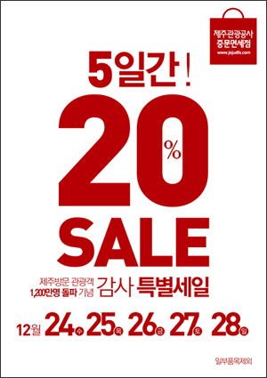 제주관광공사(사장 최갑열)는 ‘대한민국 관광수도, 제주’가 올해 1200만명 관광객 시대를 맞이함에 따라 24~28일 5일간 20% 할인 행사를 시행한다고 24일 밝혔다. 일부 브랜드는 제외다.