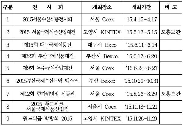 도는 '2015 서울국제식품산업대전', '한가위명절선물전' 등 올해 국내서 열리는 9개 식품박람회에 도내 식품산업체들이 적극 참여할 수 있도록 지원함으로써 제주산 청정 농특산품의 브랜드 가치를 높이고 새로운 수요를 창출하는 기회로 삼기로 했다.