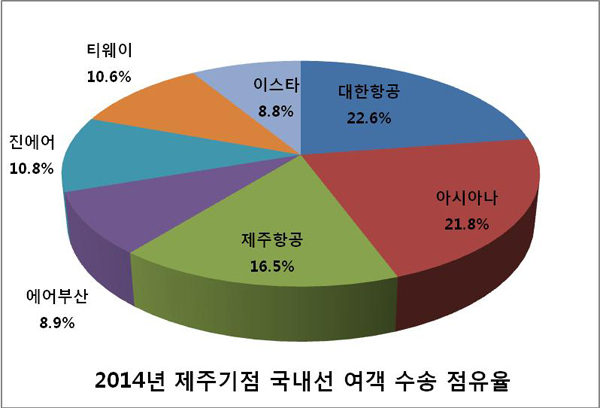 2013년 제주기점 국내선의 여객 수송분담률은 LCC 53.7%, 기존항공사 46.3%였다. 2012년은 LCC 49.6%, 기존항공사 50.4%였다.