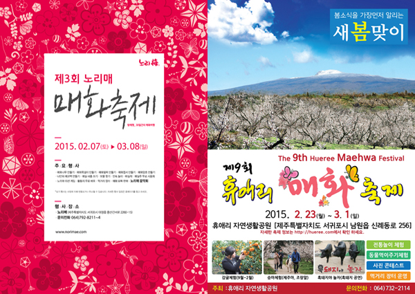'제3회 노리매 매화축제'는 7일부터 다음달 8일까지 서귀포시 대정읍 노리매에서, '제9회 휴애리 매화축제'는 23일부터 다음달 1일까지 서귀포시 남원읍 신례리 휴애리자연생활공원에서 각각 진행된다.