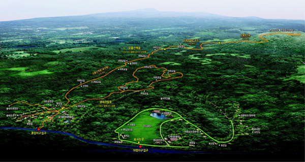 오름산책로 초입에 예전 밭을 일구던 산전이나 숯가마 터 등이 흩어져 있다. 각각의 숲길 곳곳에 그룹별로 생태체험이 가능한 야외교실 20여개소가 자리잡고 있다.