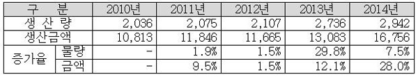 이는 전년도 생산량 2736t 대비 7%, 생산액은 130억8300만원 보다 28% 증가한 것이다.