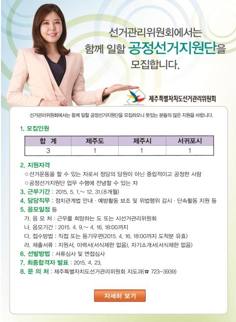 제주도선거관리위원회는 내년 4월 13일 실시하는 제20대 국회의원 선거를 앞두고 함께 일할 '공정선거지원단'을 모집한다고 31일 밝혔다.