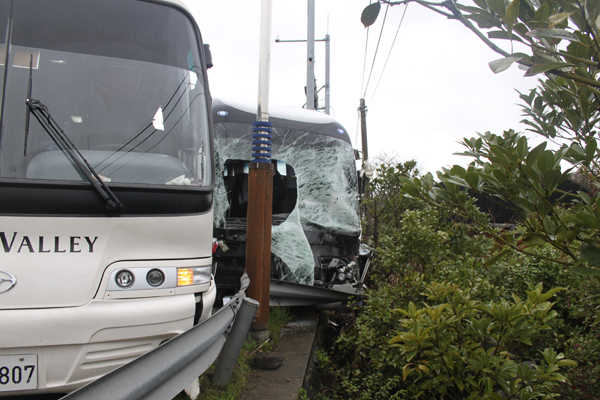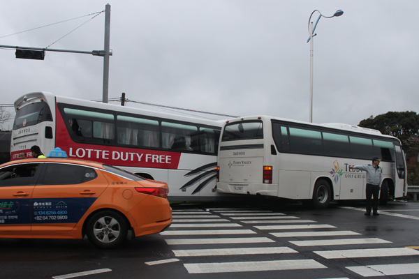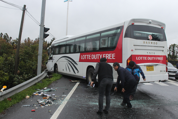 경찰은 일주도로상으로 우회전하던 골프장 버스와 서귀포 방향으로 직진하던 면세점 직원용 버스가 충돌한 것으로 보고 버스기사와 승객 등을 상대로 정확한 사고 경위를 조사하고 있다. [제이누리=김경미 기자]