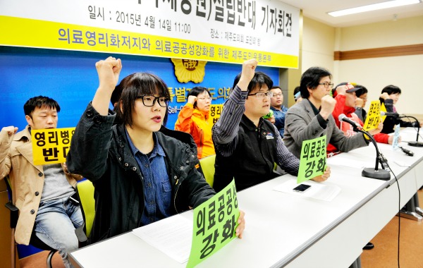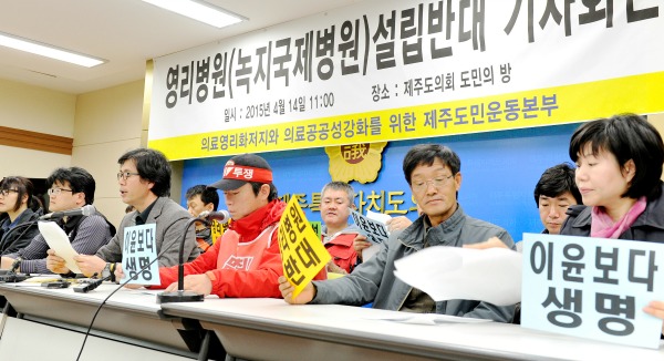 도내 30여개 시민사회단체로 구성된 '의료영리화 저지와 의료공공성 강화를 위한 제주도민운동본부(이하 영리병원 저지본부)'는 14일 오전 제주도의회 도민의 방에서 기자회견을 열고 "영리병원 설립을 불허해야 한다"고 주장했다.