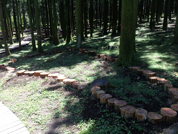 절몰 휴양림에서 남편의 이목을 집중시킨 물건 하나를 발견했습니다. 위의 사진에 보이는 멍석(?)입니다. 이것은 무엇에 쓰일까? 참 신기했는데요, 얼마 되지 않아 궁금증은 풀렸답니다. 바로 산책로를 따라 펼쳐 놓는 물건이었습니다. 아마도 산책로 밖으로 나가기 쉬운 곳들의 흙 마모를 줄이고 구멍이 뚫려, 그사이 풀이 삐져나와 미관상 커버를 위한 것이 아니었나 싶었답니다.