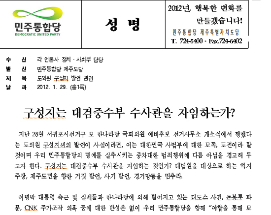 민주통합당은 '구성지는 대검중수부 수사관을 자임하는가?' 제하의 성명에서 "지난 28일 서귀포시선거구 모 한나라당 국회의원 예비후보 선거사무소 개소식에서 행했다는 도의원 구성지씨의 발언이 사실이라면, 이는 대한민국 사법부에 대한 모독, 도전이며 민주통합당의 명예를 실추시키는 중차대한 범죄행위"라며 "대법원을 대상으로 하는 억지 주장, 제주도민을 향한 거짓 발언, 사기 발언, 경거망동을 멈추라"고 주장했다.