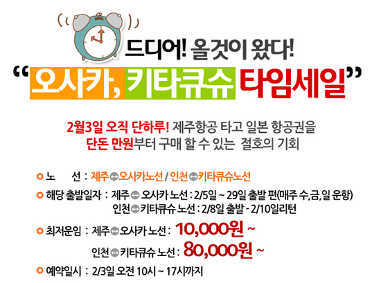 제주항공이 3일 오전 10시부터 오후 5시까지 제주~오사카 항공권을 1만원에 판매하는 깜짝 할인 이벤트를 진행하고 있다.
