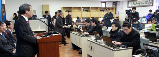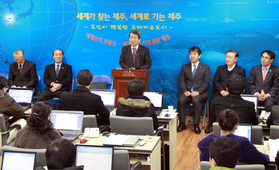 또 제주도가 세계 7대 자연경관에 선정된 사실에 대해 의혹을 제기한 언론에 대해 강한 어조로 불쾌감을 표시하면서 기자 회견 대부분을 비판 언론을 비난하는데 할애했다.