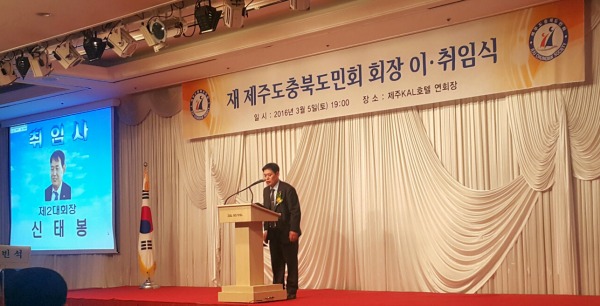 제주도충북도민회는 5일 오후 7시 제주시 이도1동 제주KAL호텔에서 제주도충북도민회 회장 이·취임식을 열고, 신태봉씨를 신임 회장으로 선출했다.