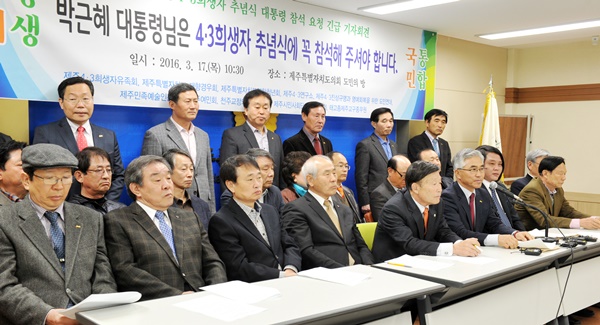 4·3희생자유족회 등 4·3 관련 단체와 제주도 재향경우회, 제주도 연합청년회 등 10개 단체는 이날 오전 제주도의회 도민의 방에서 기자회견을 열고 '제68주년 4·3희생자 추념식' 대통령 참석을 호소했다.