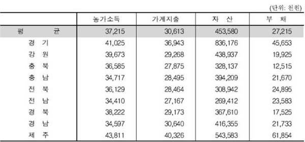 제주지역 농가소득은 4381만원으로 가장 높았다. 전국 9개 도의 평균 농가소득은 3721만원이었다. 제주에 이어 경기 4102만원, 강원 3967만원, 경북 3822만원, 충북 3658만원 순으로 농가소득이 높았다.