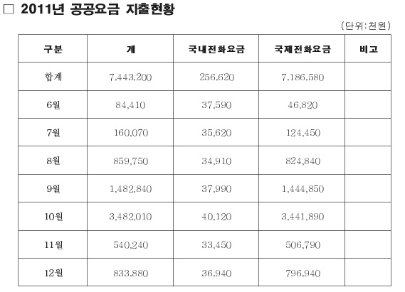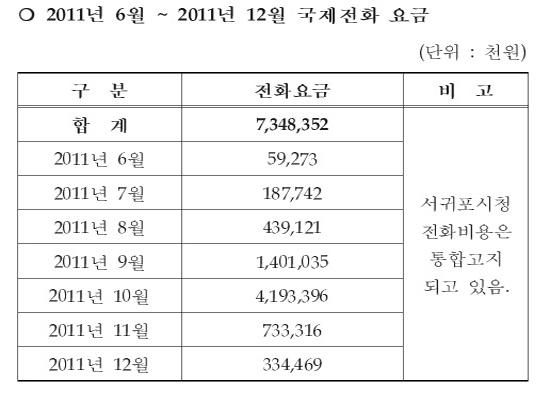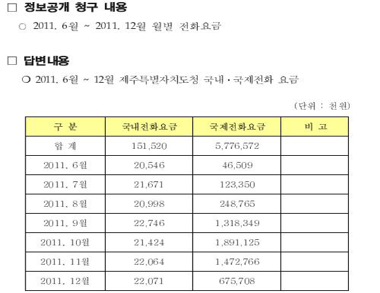 투명사회를 위한 정보공개센터(대표 하승수)가 제주도와 제주시, 서귀포시에 2011년 6월부터 12월까지 월별 전화요금공개를 청구한 결과 8월부터 투표가 종료된 11월까지 국제전화요금은 제주시 63억9000여만원, 서귀포시 70억1000여만원, 제주도청 51억여원 등 185억원이었다.
