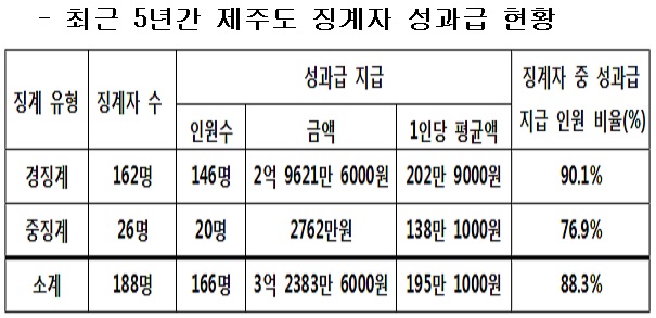 이 중 제주지역은 징계공무원 188명 중 88%에 해당하는 166명에게 성과급을 지급한 것으로 알려졌다. 이들에게 지급된 금액은 3억 2383만 6000원. 1인당 195만1000원씩 받은 셈이다.