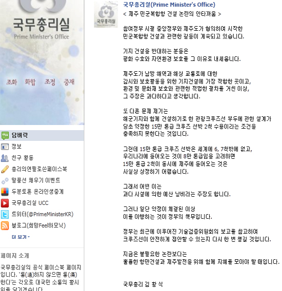 김 총리는 '제주 민군복합항 건설 논란의 안타까움'이란 제목으로 "참여정부 시절 중앙정부와 제주도가 협의해 시작한 민군복합항 건설과 관련한 갈등이 계속되고 있다"며 "지금은 불필요한 논란보다는 훌륭한 항만건설과 제주발전을 위해 함께 지혜를 모아야 할 때"라고 말했다.