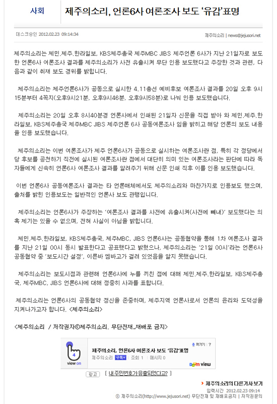 인터넷신문 제주의소리는 도내 언론6개사가 총선 공동여론조사 결과를 발표.보도하기 전에 허락없이 먼저 보도한데 대해 "보도시간 설정 사실을 몰랐다"고 해명했다.