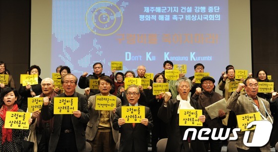 '제주해군기지 건설 저지를 위한 전국대책회의'는 이날 오전 9시30분 서울 중구 프레스센터 20층 국제회의장에서 ‘제주해군기지 건설 강행 중단, 평화적 해결 촉구 비상시국회의’를 갖고 정부의 해군기지 건설 강행을 비판했다.