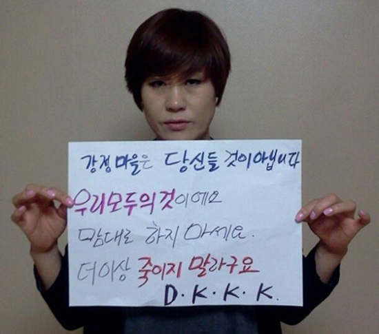 가수 신효범은 7일 자신의 트위터에 "강정마을은 당신들 것이 아닙니다. 우리 모두의 것이에요. 맘대로 하지 마세요. 더 이상 죽이지 말라고요. D.K.K.K."라는 메시지를 들고 있는 자신의 사진을 게재했다.