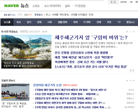 네이버 등 각종 포털 사이트에서 해군기지 건설 현장인 서귀포시 강정동 '구럼비'가 검색어 순위 1위를 차지하고, 페이스북과 트위터 등 SNS를 통해 현지 상황이 실시간으로 전국에 전파되고 있다.