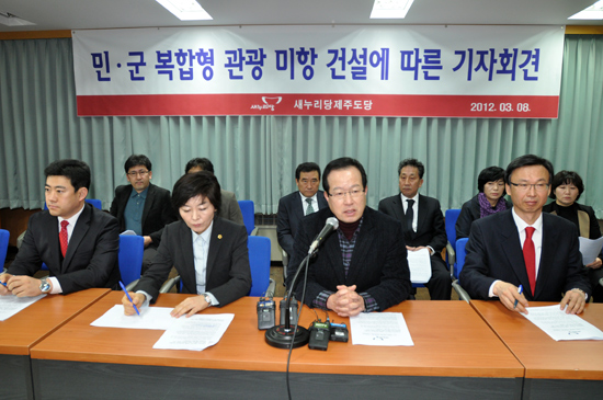 새누리당 제주도당 당직자, 소속 제주지역 국회의원 예비후보와 도의원들은 8일 오전 제주도의회 도민의 방에서 기자회견을 갖고 제주해군기지 관련 입장을 밝혔다.