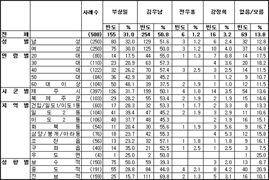 남성은 '김우남 51.6%-부상일 32.0%', 여성은 '김우남 50.0%-부상일 30.0%'를 기록했다.