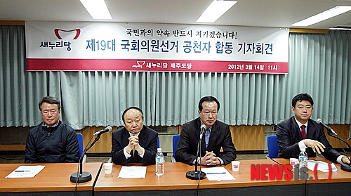 새누리당 4.11 총선 제주지역 후보들이 14일 합동 기자회견에서 총선을 앞두고 '아킬레스건'이 될 수 있는 해군기지(민군복합형관광미항)와 4.3 문제와 관련해 나름대로 소신과 입장을 밝혔다.