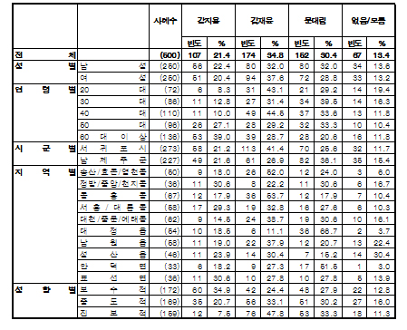 연령별 조사에선 20대는 김재윤 43.1%, 문대림 29.2%, 강지용 8.3% 순이었다.