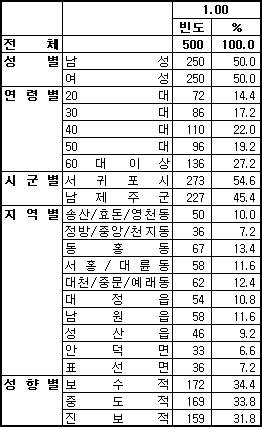 성향별 조사에선 보수층은 강지용 후보(34.9%)를 선호했다. 이어 문대림 27.9%, 김재윤 24.4% 순이었다.