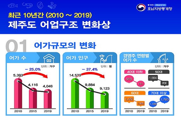 27일 호남지방통계청이 발표한 '최근 10년간 제주 어업구조 변화상'에 따르면 지난해 제주도 어가 수와 어가 인구는 4046가구, 9123명으로 2010년 대비 1347가구(-25%), 5450명(-37.4%)이 줄어들었다.