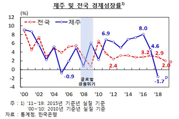 다만 2018년에는 2005년 이후 13년 만에 제주지역 GRDP 성장률이 마이너스(-1.7%)를 기록하는 등 둔화한 것으로 나타났다.