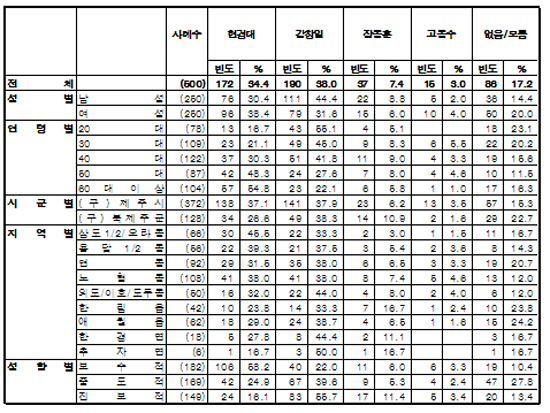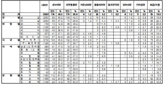 정치 성향별 조사에선 진보층과 중도층은 민주통합당 강창일 의원을 지지한 반면, 보수층은 새누리당 현경대 후보를 선호했다.