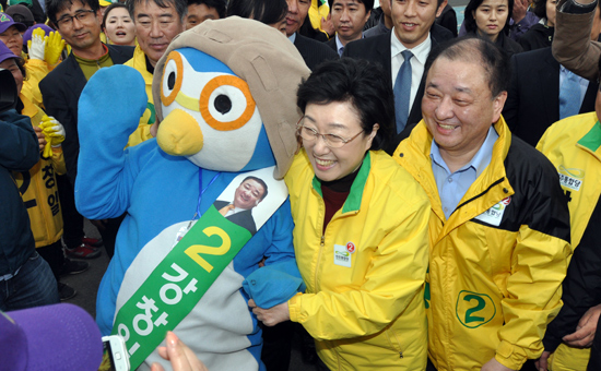 한 대표는 2일 오후 제주시 민속오일시장에서 가진 강창일(제주시 갑)·김우남(제주시 을) 후보 지원연설에서 "제주 총선 후보를 19대 국회에 보내주면 정권 교체를 이뤄내 제주 신공항을 반드시 만들어 내겠다"고 밝혔다.