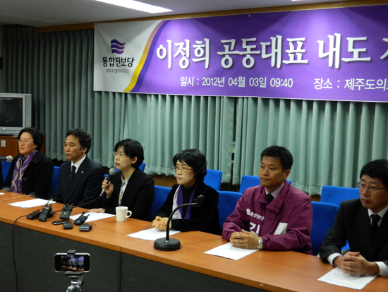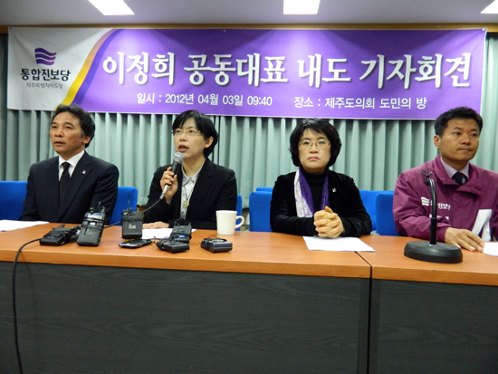 이정희 대표와 비례대표 후보인 오옥만 제주도당공동위원장 등은 3일 제주도의회 도민의 방에서 제주 현안 관련 기자회견을 갖고 제주4·3 64주년을 맞아 제주도민에게 위로를 전하고, 임기내 위령제에 한번도 참석하지 않은 이명박 대통령에게 유감의 뜻을 전했다.