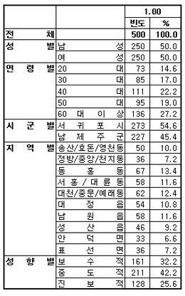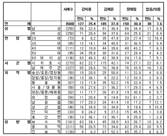 연령별 조사에선 20대는 민주통합당 김재윤 후보를, 40대는 무소속 문대림 후보, 60대 이상은 새누리당 강지용 후보를 더 지지하는 것으로 조사됐다.