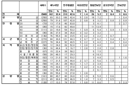 전체 부동층 비율이 7.6%로 비교적 낮게 나타난 가운데 지역별 지지도 조사에서 남원읍(12.1%)과 성산읍(10.9%)을 제외한 전 지역이 10% 이내로 나타나 어느 정도 판세를 가늠할 수 있게 됐다.