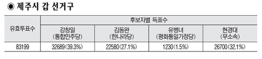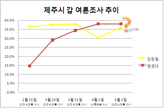 중앙일보의 지난 달 31일 조사에선 현경대 후보 30.7%, 강창일 후보 30.1%로 오차 범위 내 박빙이지만 처음으로 현 후보가 강 후보를 추월했다.