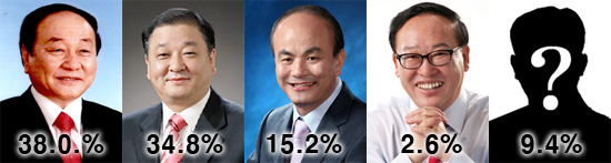 무소속 장동훈 후보는 15.2%, 무소속 고동수 후보 2.6%로 나타났다. 부동층은 9.4%로 지난 30~31일 조사 당시(17.2%)보다 7.8%포인트 떨어졌다.